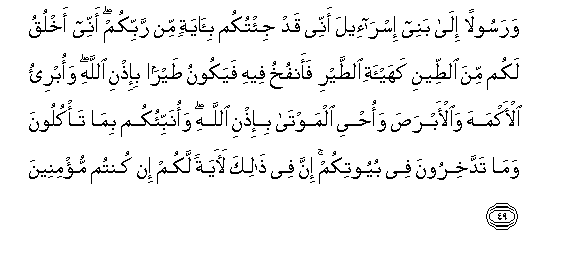 49. Warasoolan ila banee isra-eela annee qad ji/tukum bi-ayatin min rabbikum annee akhluqu lakum mina altteeni kahay-ati alttayri faanfukhu feehi fayakoonu tayran bi-ithni Allahi waobri-o al-akmaha waal-abrasa waohyee almawta bi-ithni Allahi waonabbi-okum bima ta/kuloona wama taddakhiroona fee buyootikum inna fee thalika laayatan lakum in kuntum mu/mineena