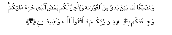 50. Wamusaddiqan lima bayna yadayya mina alttawrati wali-ohilla lakum baAAda allathee hurrima AAalaykum waji/tukum bi-ayatin min rabbikum faittaqoo Allaha waateeAAooni
