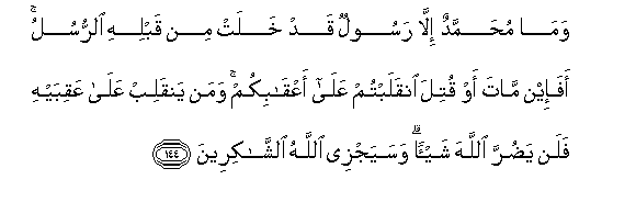 144. Wama muhammadun illa rasoolun qad khalat min qablihi alrrusulu afa-in mata aw qutila inqalabtum AAala aAAqabikum waman yanqalib AAala AAaqibayhi falan yadurra Allaha shay-an wasayajzee Allahu alshshakireena