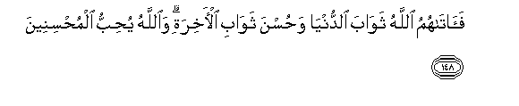 148. Faatahumu Allahu thawaba alddunya wahusna thawabi al-akhirati waAllahu yuhibbu almuhsineena