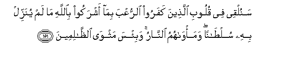 151. Sanulqee fee quloobi allatheena kafaroo alrruAAba bima ashrakoo biAllahi ma lam yunazzil bihi sultanan wama/wahumu alnnaru wabi/sa mathwa alththalimeena