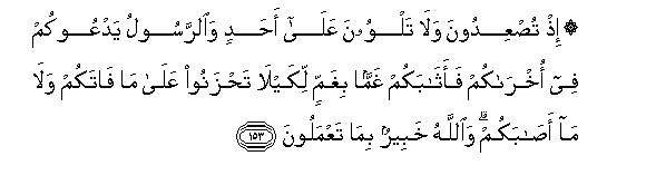 153. Ith tusAAidoona wala talwoona AAala ahadin waalrrasoolu yadAAookum fee okhrakum faathabakum ghamman bighammin likay la tahzanoo AAala ma fatakum wala ma asabakum waAllahu khabeerun bima taAAmaloona