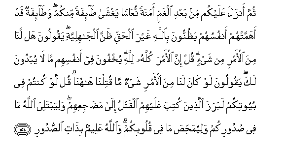 154. Thumma anzala AAalaykum min baAAdi alghammi amanatan nuAAasan yaghsha ta-ifatan minkum wata-ifatun qad ahammat-hum anfusuhum yathunnoona biAllahi ghayra alhaqqi thanna aljahiliyyati yaqooloona hal lana mina al-amri min shay-in qul inna al-amra kullahu lillahi yukhfoona fee anfusihim ma la yubdoona laka yaqooloona law kana lana mina al-amri shay-on ma qutilna hahuna qul law kuntum fee buyootikum labaraza allatheena kutiba AAalayhimu alqatlu ila madajiAAihim waliyabtaliya Allahu ma fee sudoorikum waliyumahhisa ma fee quloobikum waAllahu AAaleemun bithati alssudoori