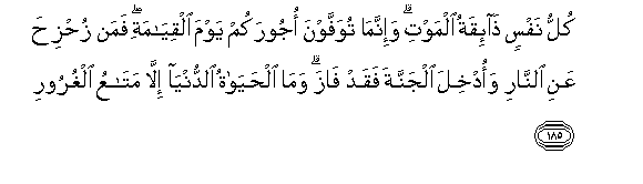 185. Kullu nafsin tha-iqatu almawti wa-innama tuwaffawna ojoorakum yawma alqiyamati faman zuhziha AAani alnnari waodkhila aljannata faqad faza wama alhayatu alddunya illa mataAAu alghuroori