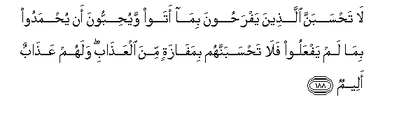 188. La tahsabanna allatheena yafrahoona bima ataw wayuhibboona an yuhmadoo bima lam yafAAaloo fala tahsabannahum bimafazatin mina alAAathabi walahum AAathabun aleemun