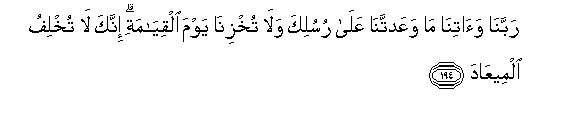 194. Rabbana waatina ma waAAadtana AAala rusulika wala tukhzina yawma alqiyamati innaka la tukhlifu almeeAAada
