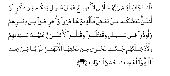 195. Faistajaba lahum rabbuhum annee la odeeAAu AAamala AAamilin minkum min thakarin aw ontha baAAdukum min baAAdin faallatheena hajaroo waokhrijoo min diyarihim waoothoo fee sabeelee waqataloo waqutiloo laokaffiranna AAanhum sayyi-atihim walaodkhilannahum jannatin tajree min tahtiha al-anharu thawaban min AAindi Allahi waAllahu AAindahu husnu alththawabi