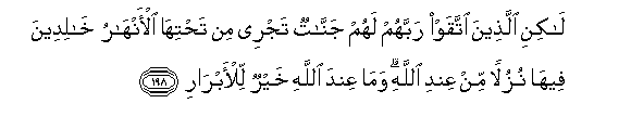 198. Lakini allatheena ittaqaw rabbahum lahum jannatun tajree min tahtiha al-anharu khalideena feeha nuzulan min AAindi Allahi wama AAinda Allahi khayrun lil-abrari