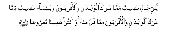 7. Lilrrijali naseebun mimma taraka alwalidani waal-aqraboona walilnnisa-i naseebun mimma taraka alwalidani waal-aqraboona mimma qalla minhu aw kathura naseeban mafroodan