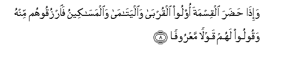 8. Wa-itha hadara alqismata oloo alqurba waalyatama waalmasakeenu faorzuqoohum minhu waqooloo lahum qawlan maAAroofan