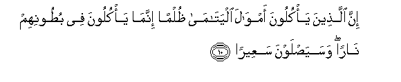10. Inna allatheena ya/kuloona amwala alyatama thulman innama ya/kuloona fee butoonihim naran wasayaslawna saAAeeran