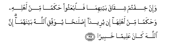35. Wa-in khiftum shiqaqa baynihima faibAAathoo hakaman min ahlihi wahakaman min ahliha in yureeda islahan yuwaffiqi Allahu baynahuma inna Allaha kana AAaleeman khabeeran
