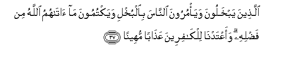 37. Allatheena yabkhaloona waya/muroona alnnasa bialbukhli wayaktumoona ma atahumu Allahu min fadlihi waaAAtadna lilkafireena AAathaban muheenan
