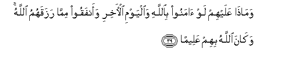 39. Wamatha AAalayhim law amanoo biAllahi waalyawmi al-akhiri waanfaqoo mimma razaqahumu Allahu wakana Allahu bihim AAaleeman