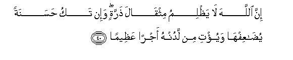 40. Inna Allaha la yathlimu mithqala tharratin wa-in taku hasanatan yudaAAifha wayu/ti min ladunhu ajran AAatheeman