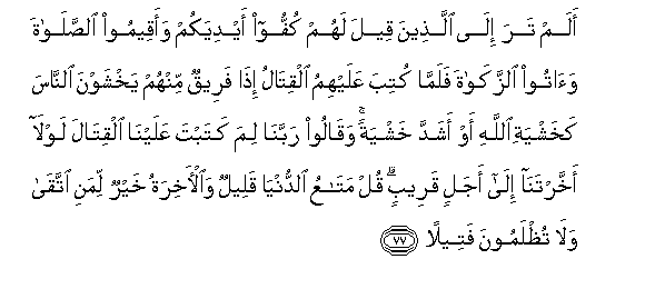 77. Alam tara ila allatheena qeela lahum kuffoo aydiyakum waaqeemoo alssalata waatoo alzzakata falamma kutiba AAalayhimu alqitalu itha fareequn minhum yakhshawna alnnasa kakhashyati Allahi aw ashadda khashyatan waqaloo rabbana lima katabta AAalayna alqitala lawla akhkhartana ila ajalin qareebin qul mataAAu alddunya qaleelun waal-akhiratu khayrun limani ittaqa wala tuthlamoona fateelan