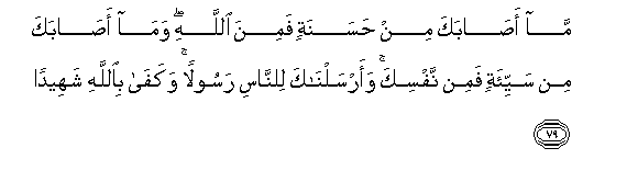 79. Ma asabaka min hasanatin famina Allahi wama asabaka min sayyi-atin famin nafsika waarsalnaka lilnnasi rasoolan wakafa biAllahi shaheedan