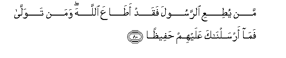 80. Man yutiAAi alrrasoola faqad ataAAa Allaha waman tawalla fama arsalnaka AAalayhim hafeethan