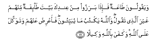81. Wayaqooloona taAAatun fa-itha barazoo min AAindika bayyata ta-ifatun minhum ghayra allathee taqoolu waAllahu yaktubu ma yubayyitoona faaAArid AAanhum watawakkal AAala Allahi wakafa biAllahi wakeelan