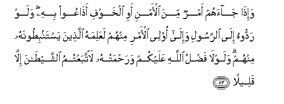 83. Wa-itha jaahum amrun mina al-amni awi alkhawfi athaAAoo bihi walaw raddoohu ila alrrasooli wa-ila olee al-amri minhum laAAalimahu allatheena yastanbitoonahu minhum walawla fadlu Allahi AAalaykum warahmatuhu laittabaAAtumu alshshaytana illa qaleelan