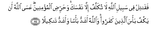 84. Faqatil fee sabeeli Allahi la tukallafu illa nafsaka waharridi almu/mineena AAasa Allahu an yakuffa ba/sa allatheena kafaroo waAllahu ashaddu ba/san waashaddu tankeelan
