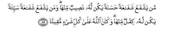 85. Man yashfaAA shafaAAatan hasanatan yakun lahu naseebun minha waman yashfaAA shafaAAatan sayyi-atan yakun lahu kiflun minha wakana Allahu AAala kulli shay-in muqeetan