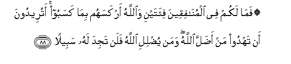 88. Fama lakum fee almunafiqeena fi-atayni waAllahu arkasahum bima kasaboo atureedoona an tahdoo man adalla Allahu waman yudlili Allahu falan tajida lahu sabeelan