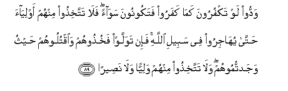 89. Waddoo law takfuroona kama kafaroo fatakoonoona sawaan fala tattakhithoo minhum awliyaa hatta yuhajiroo fee sabeeli Allahi fa-in tawallaw fakhuthoohum waoqtuloohum haythu wajadtumoohum wala tattakhithoo minhum waliyyan wala naseeran