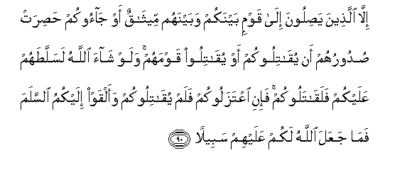 90. Illa allatheena yasiloona ila qawmin baynakum wabaynahum meethaqun aw jaookum hasirat sudooruhum an yuqatilookum aw yuqatiloo qawmahum walaw shaa Allahu lasallatahum AAalaykum falaqatalookum fa-ini iAAtazalookum falam yuqatilookum waalqaw ilaykumu alssalama fama jaAAala Allahu lakum AAalayhim sabeelan