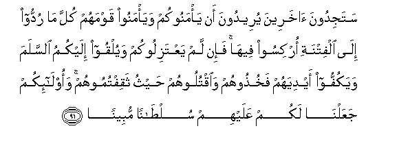 91. Satajidoona akhareena yureedoona an ya/manookum waya/manoo qawmahum kulla ma ruddoo ila alfitnati orkisoo feeha fa-in lam yaAAtazilookum wayulqoo ilaykumu alssalama wayakuffoo aydiyahum fakhuthoohum waoqtuloohum haythu thaqiftumoohum waola-ikum jaAAalna lakum AAalayhim sultanan mubeenan