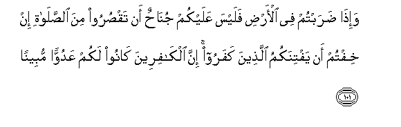 101. Wa-itha darabtum fee al-ardi falaysa AAalaykum junahun an taqsuroo mina alssalati in khiftum an yaftinakumu allatheena kafaroo inna alkafireena kanoo lakum AAaduwwan mubeenan