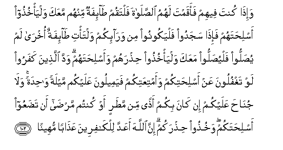102. Wa-itha kunta feehim faaqamta lahumu alssalata faltaqum ta-ifatun minhum maAAaka walya/khuthoo aslihatahum fa-itha sajadoo falyakoonoo min wara-ikum walta/ti ta-ifatun okhra lam yusalloo falyusalloo maAAaka walya/khuthoo hithrahum waaslihatahum wadda allatheena kafaroo law taghfuloona AAan aslihatikum waamtiAAatikum fayameeloona AAalaykum maylatan wahidatan wala junaha AAalaykum in kana bikum athan min matarin aw kuntum marda an tadaAAoo aslihatakum wakhuthoo hithrakum inna Allaha aAAadda lilkafireena AAathaban muheenan