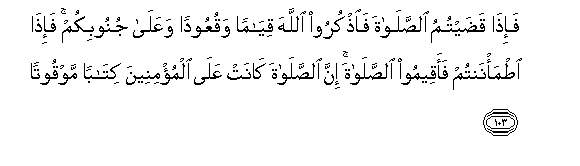 103. Fa-itha qadaytumu alssalata faothkuroo Allaha qiyaman waquAAoodan waAAala junoobikum fa-itha itma/nantum faaqeemoo alssalata inna alssalata kanat AAala almu/mineena kitaban mawqootan