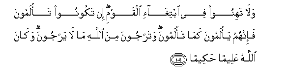 104. Wala tahinoo fee ibtigha-i alqawmi in takoonoo ta/lamoona fa-innahum ya/lamoona kama ta/lamoona watarjoona mina Allahi ma la yarjoona wakana Allahu AAaleeman hakeeman