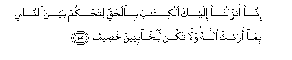 105. Inna anzalna ilayka alkitaba bialhaqqi litahkuma bayna alnnasi bima araka Allahu wala takun lilkha-ineena khaseeman