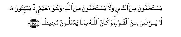 108. Yastakhfoona mina alnnasi wala yastakhfoona mina Allahi wahuwa maAAahum ith yubayyitoona ma la yarda mina alqawli wakana Allahu bima yaAAmaloona muheetan