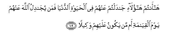 109. Haantum haola-i jadaltum AAanhum fee alhayati alddunya faman yujadilu Allaha AAanhum yawma alqiyamati am man yakoonu AAalayhim wakeelan