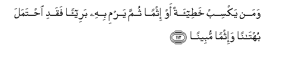 112. Waman yaksib khatee-atan aw ithman thumma yarmi bihi baree-an faqadi ihtamala buhtanan wa-ithman mubeenan