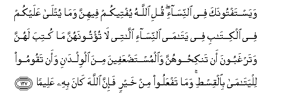 127. Wayastaftoonaka fee alnnisa-i quli Allahu yufteekum feehinna wama yutla AAalaykum fee alkitabi fee yatama alnnisa-i allatee la tu/toonahunna ma kutiba lahunna watarghaboona an tankihoohunna waalmustadAAafeena mina alwildani waan taqoomoo lilyatama bialqisti wama tafAAaloo min khayrin fa-inna Allaha kana bihi AAaleeman