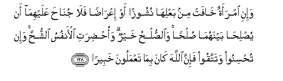 128. Wa-ini imraatun khafat min baAAliha nushoozan aw iAAradan fala junaha AAalayhima an yusliha baynahuma sulhan waalssulhu khayrun waohdirati al-anfusu alshshuhha wa-in tuhsinoo watattaqoo fa-inna Allaha kana bima taAAmaloona khabeeran