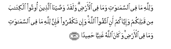131. Walillahi ma fee alssamawati wama fee al-ardi walaqad wassayna allatheena ootoo alkitaba min qablikum wa-iyyakum ani ittaqoo Allaha wa-in takfuroo fa-inna lillahi ma fee alssamawati wama fee al-ardi wakana Allahu ghaniyyan hameedan