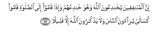 142. Inna almunafiqeena yukhadiAAoona Allaha wahuwa khadiAAuhum wa-itha qamoo ila alssalati qamoo kusala yuraoona alnnasa wala yathkuroona Allaha illa qaleelan