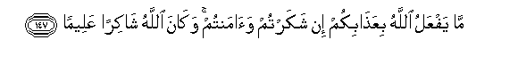 147. Ma yafAAalu Allahu biAAathabikum in shakartum waamantum wakana Allahu shakiran AAaleeman
