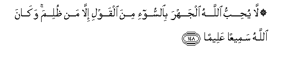 148. La yuhibbu Allahu aljahra bialssoo-i mina alqawli illa man thulima wakana Allahu sameeAAan AAaleeman