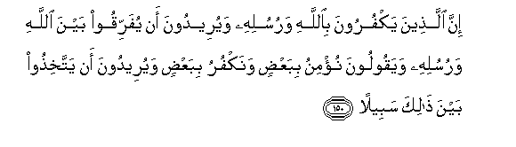 150. Inna allatheena yakfuroona biAllahi warusulihi wayureedoona an yufarriqoo bayna Allahi warusulihi wayaqooloona nu/minu bibaAAdin wanakfuru bibaAAdin wayureedoona an yattakhithoo bayna thalika sabeelan
