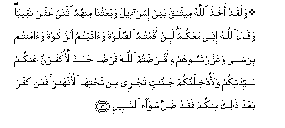 12. Walaqad akhatha Allahu meethaqa banee isra-eela wabaAAathna minhumu ithnay AAashara naqeeban waqala Allahu innee maAAakum la-in aqamtumu alssalata waataytumu alzzakata waamantum birusulee waAAazzartumoohum waaqradtumu Allaha qardan hasanan laokaffiranna AAankum sayyi-atikum walaodkhilannakum jannatin tajree min tahtiha al-anharu faman kafara baAAda thalika minkum faqad dalla sawaa alssabeeli