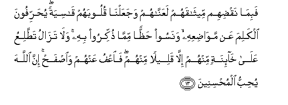 13. Fabima naqdihim meethaqahum laAAannahum wajaAAalna quloobahum qasiyatan yuharrifoona alkalima AAan mawadiAAihi wanasoo haththan mimma thukkiroo bihi wala tazalu tattaliAAu AAala kha-inatin minhum illa qaleelan minhum faoAAfu AAanhum waisfah inna Allaha yuhibbu almuhsineena