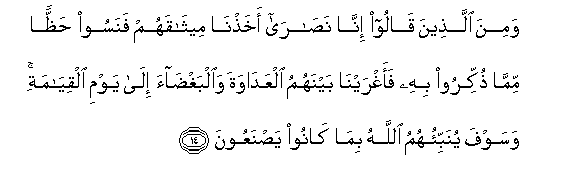 14. Wamina allatheena qaloo inna nasara akhathna meethaqahum fanasoo haththan mimma thukkiroo bihi faaghrayna baynahumu alAAadawata waalbaghdaa ila yawmi alqiyamati wasawfa yunabbi-ohumu Allahu bima kanoo yasnaAAoona