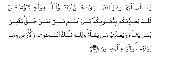 18. Waqalati alyahoodu waalnnasara nahnu abnao Allahi waahibbaohu qul falima yuAAaththibukum bithunoobikum bal antum basharun mimman khalaqa yaghfiru liman yashao wayuAAaththibu man yashao walillahi mulku alssamawati waal-ardi wama baynahuma wa-ilayhi almaseeru