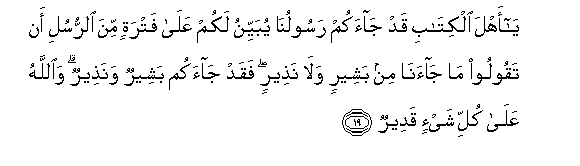 19. Ya ahla alkitabi qad jaakum rasooluna yubayyinu lakum AAala fatratin mina alrrusuli an taqooloo ma jaana min basheerin wala natheerin faqad jaakum basheerun wanatheerun waAllahu AAala kulli shay-in qadeerun